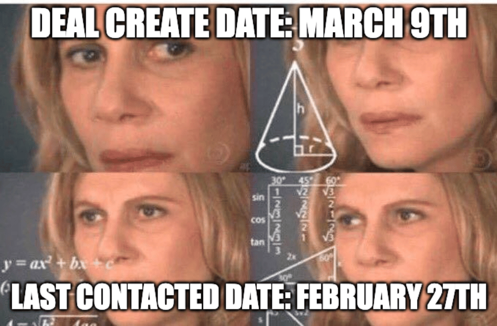 For example, if your account has multiple deals associated with single contacts, you might find that a newer deal has a create date that is actually after its last contacted date.