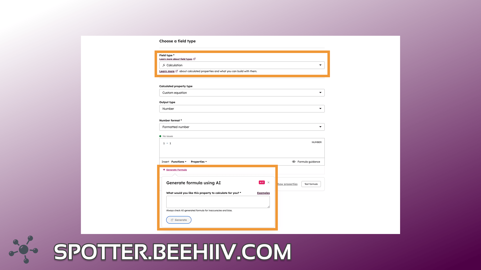 HubSpot’s AI is well-versed in the rules and will help you craft your calculation from a natural language prompt. You can open it up with the button that says “generate formula”.